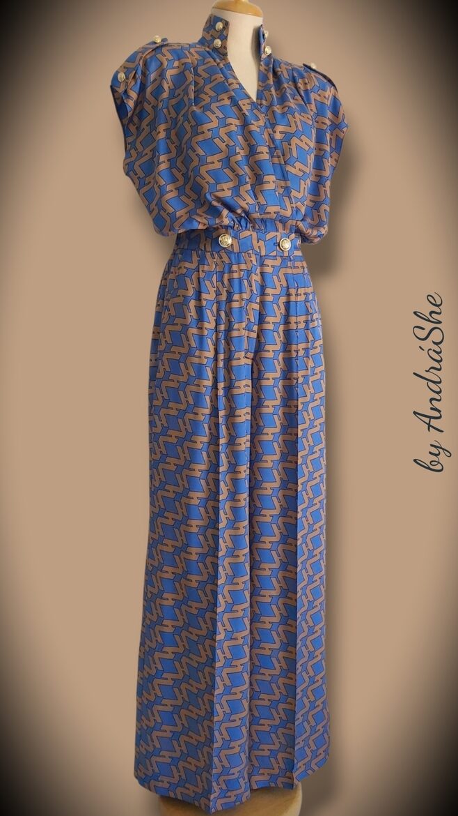 Jöjjön,ami még nem volt!Geometriaaa!A sok szépséges virág minta után most ez az egyedi szín és minta kombináció csavarta el a fejem,amit egy igazán egyedi overállá szelídítettemSúlya nem sok és a tapintása...selymes,lágy és könnyedFelülete szolíd fényű,összetétele 100% viszkóz.Fazonja lezser,mégis nőiesen elegáns ,melyet arany gombok ékesítenek.Az overál kényelmesen elől nyílik,gombbal és cipzárral záródó.Bőség hajtásai a karcsúsítást adó derékba futnak,mely hátul kényelmesen gumírozott.Nadrág részét zsebek teszik komfortossá.A nadrág szára elegánsan élrevasalt,melynek vonala milis tűzéssel irányított.